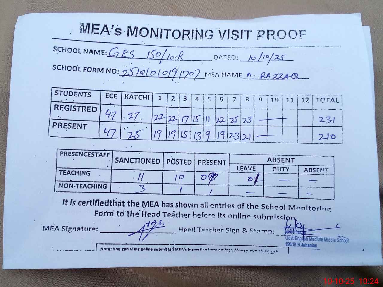 | Attendance Register | Head Teacher | MEA with School | Visit Proof |
