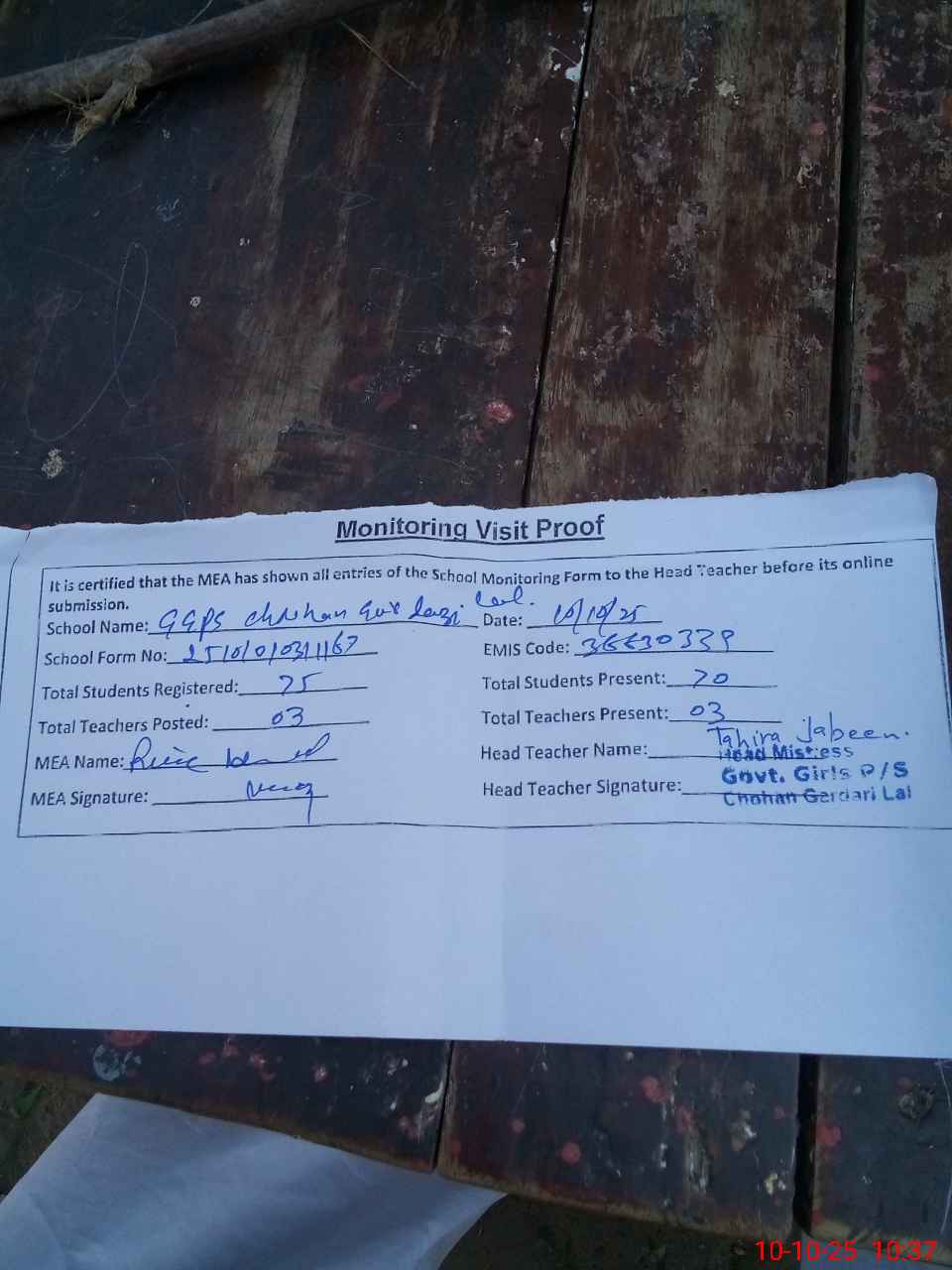 | Attendance Register | Head Teacher | MEA with School | Visit Proof |