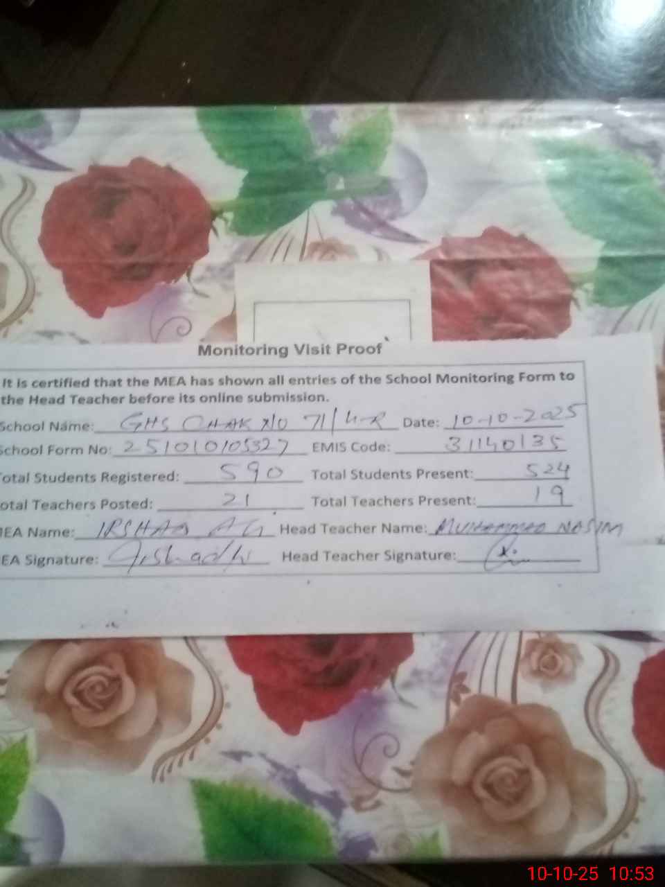 | Certified that this School was Inspected by the Undersigned MEA/DMO Today and the Information Stated Above is as Per Record. | |||||