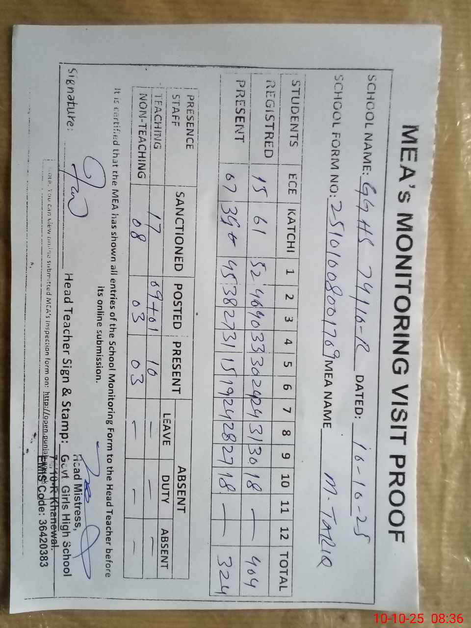 | EMIS Code: 36420383 | Name of School: GGHS 74/10-R, KHANEWAL | |||
