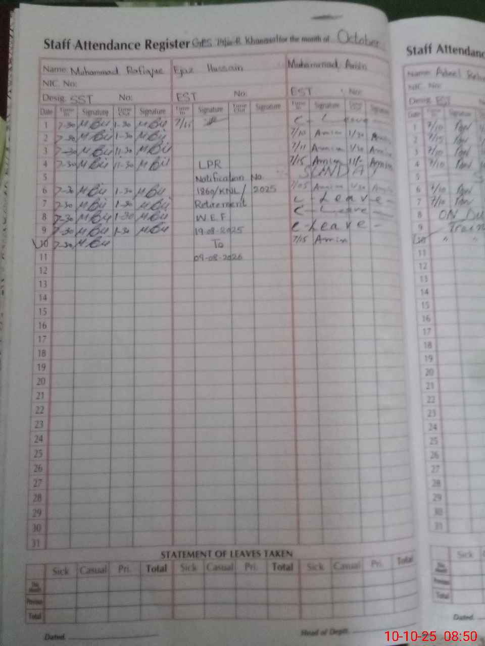 | CNIC | Full Name | Designation | R/C | Absence During Last Calender Month |