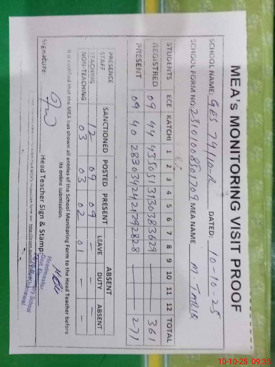 | Attendance Register | Head Teacher | MEA with School | Visit Proof |