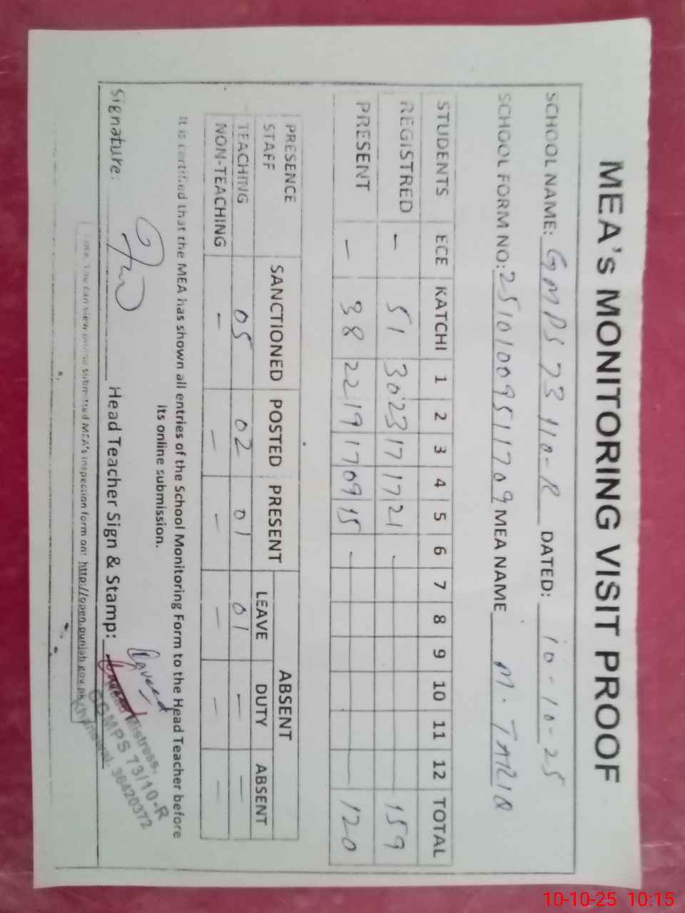 | Attendance Register | Head Teacher | MEA with School | Visit Proof |