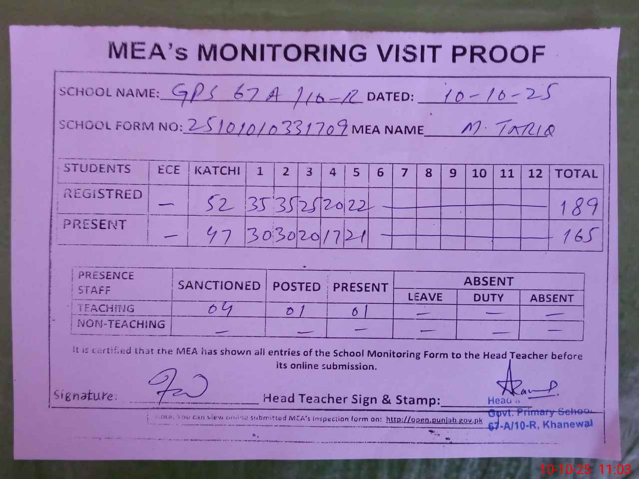 | Attendance Register | Head Teacher | MEA with School | Visit Proof |