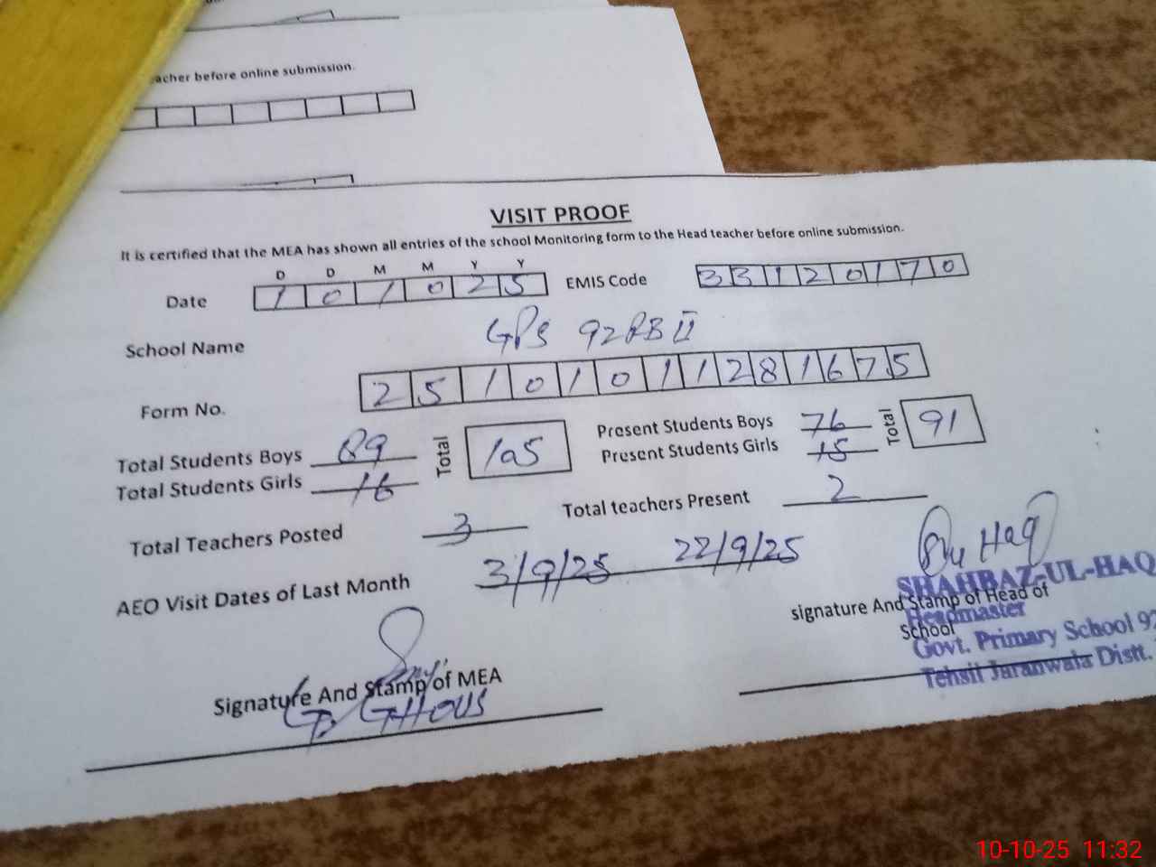 | Attendance Register | Head Teacher | MEA with School | Visit Proof |