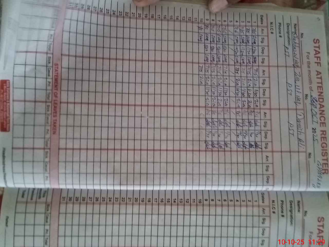 | CNIC | Full Name | Designation | R/C | Absence During Last Calender Month |