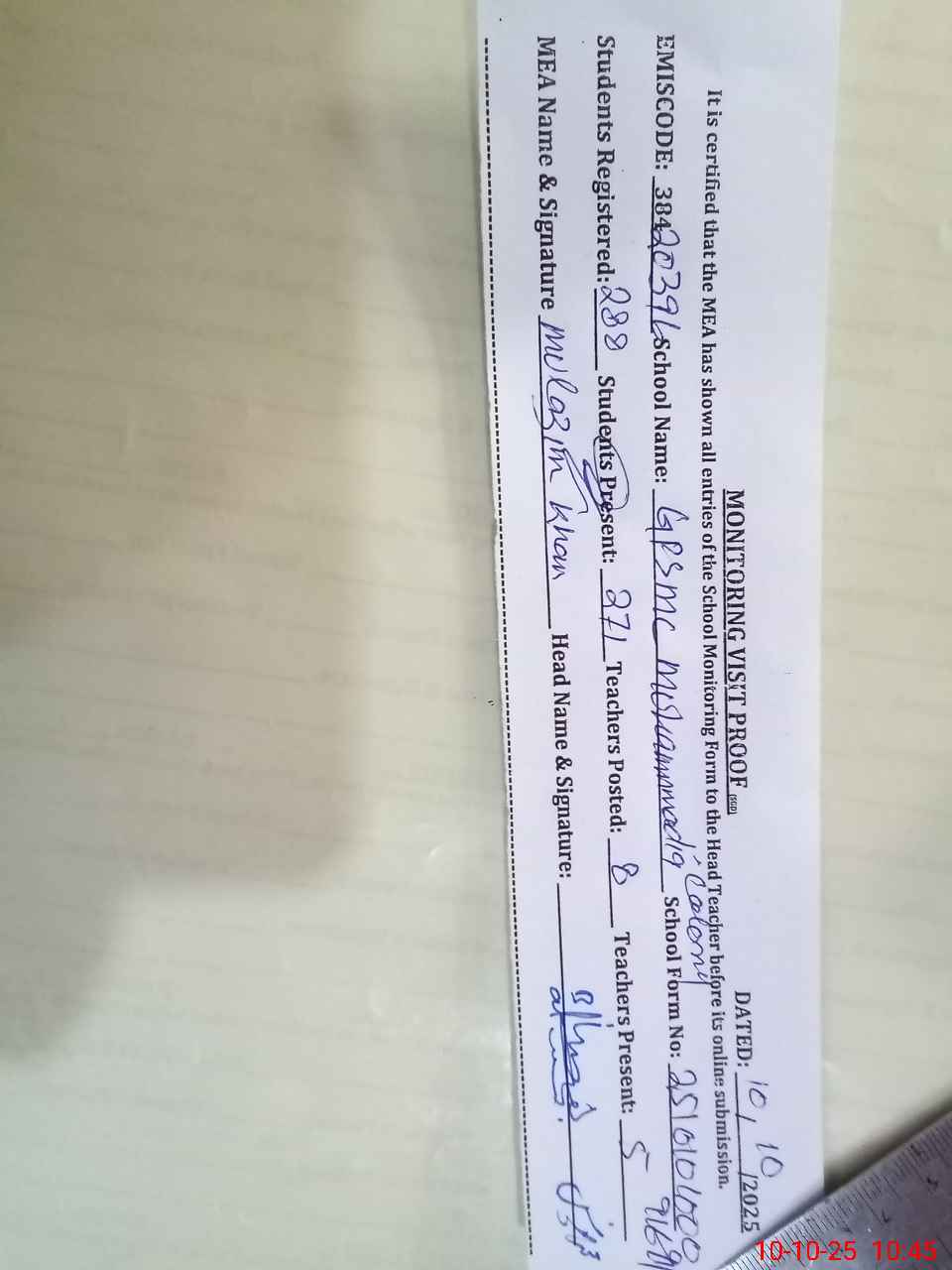 | Monitoring Date: 10-10-2025 | Start Time: 10-10-2025 10:09 AM | End Time: 10-10-2025 10:45 AM | Name of MEA: MU**** KH**** | |
