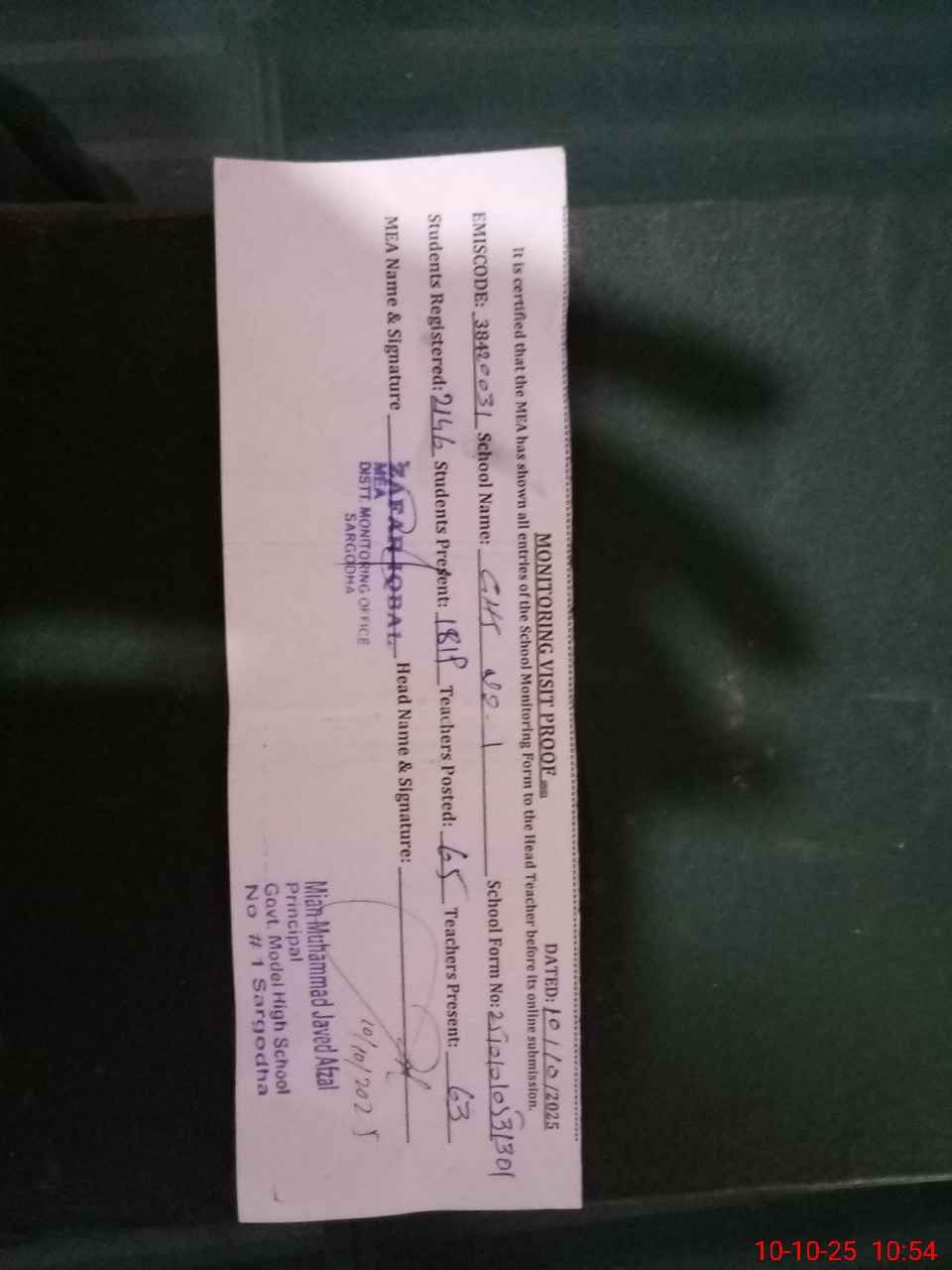 | Monitoring Date: 10-10-2025 | Start Time: 10-10-2025 09:58 AM | End Time: 10-10-2025 10:55 AM | Name of MEA: ZA**** IQ**** | |