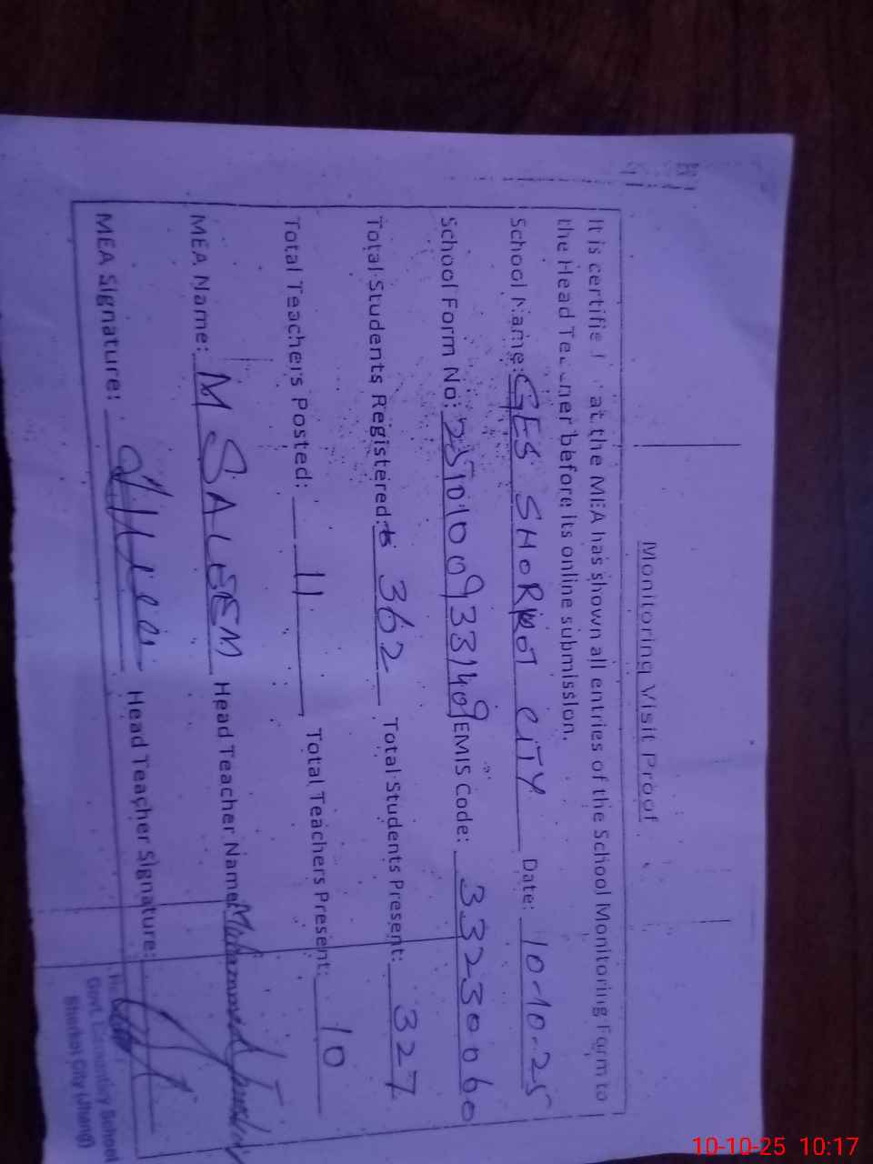 | Certified that this School was Inspected by the Undersigned MEA/DMO Today and the Information Stated Above is as Per Record. | |||||