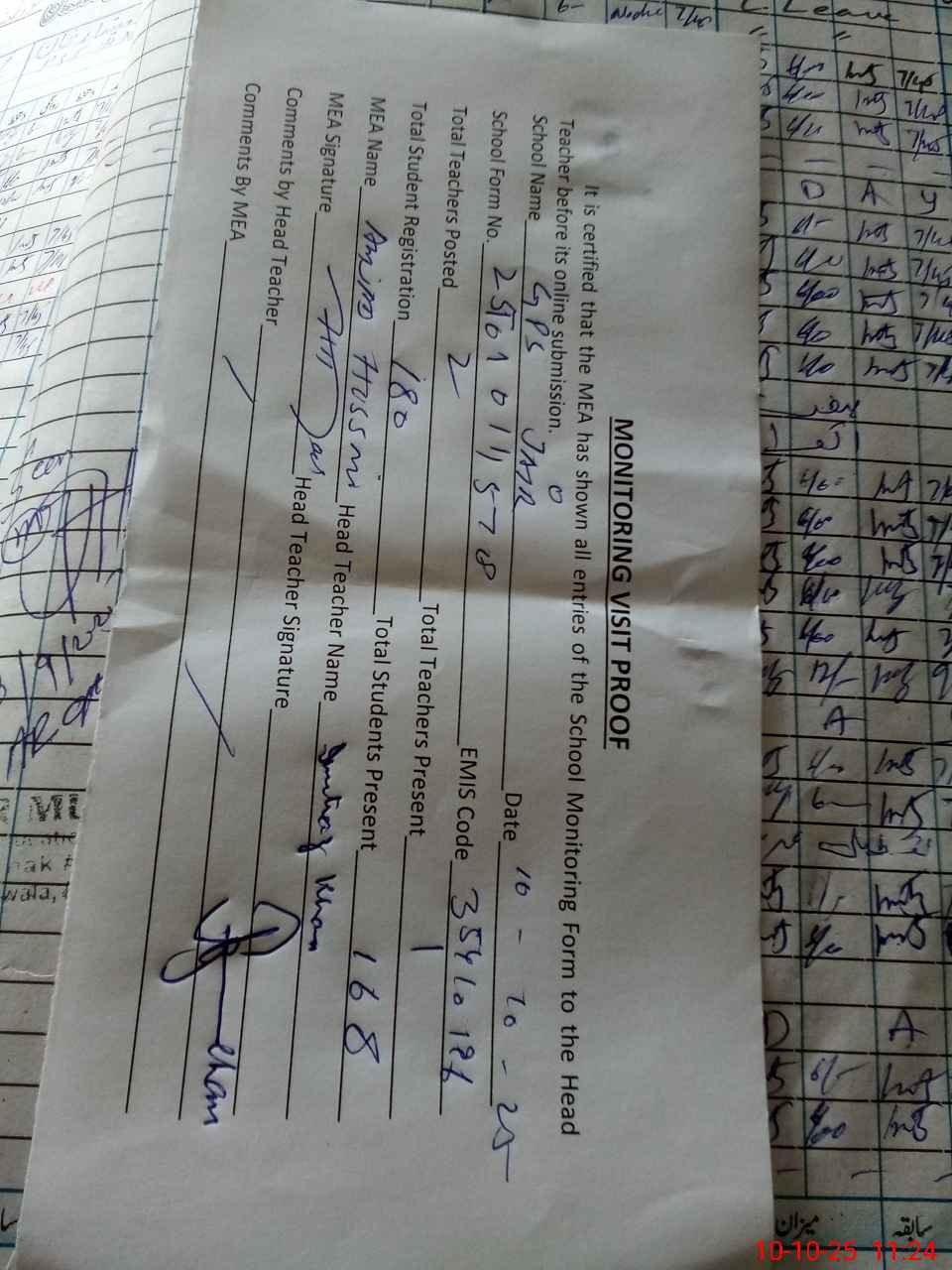 | Attendance Register | Head Teacher | MEA with School | Visit Proof |