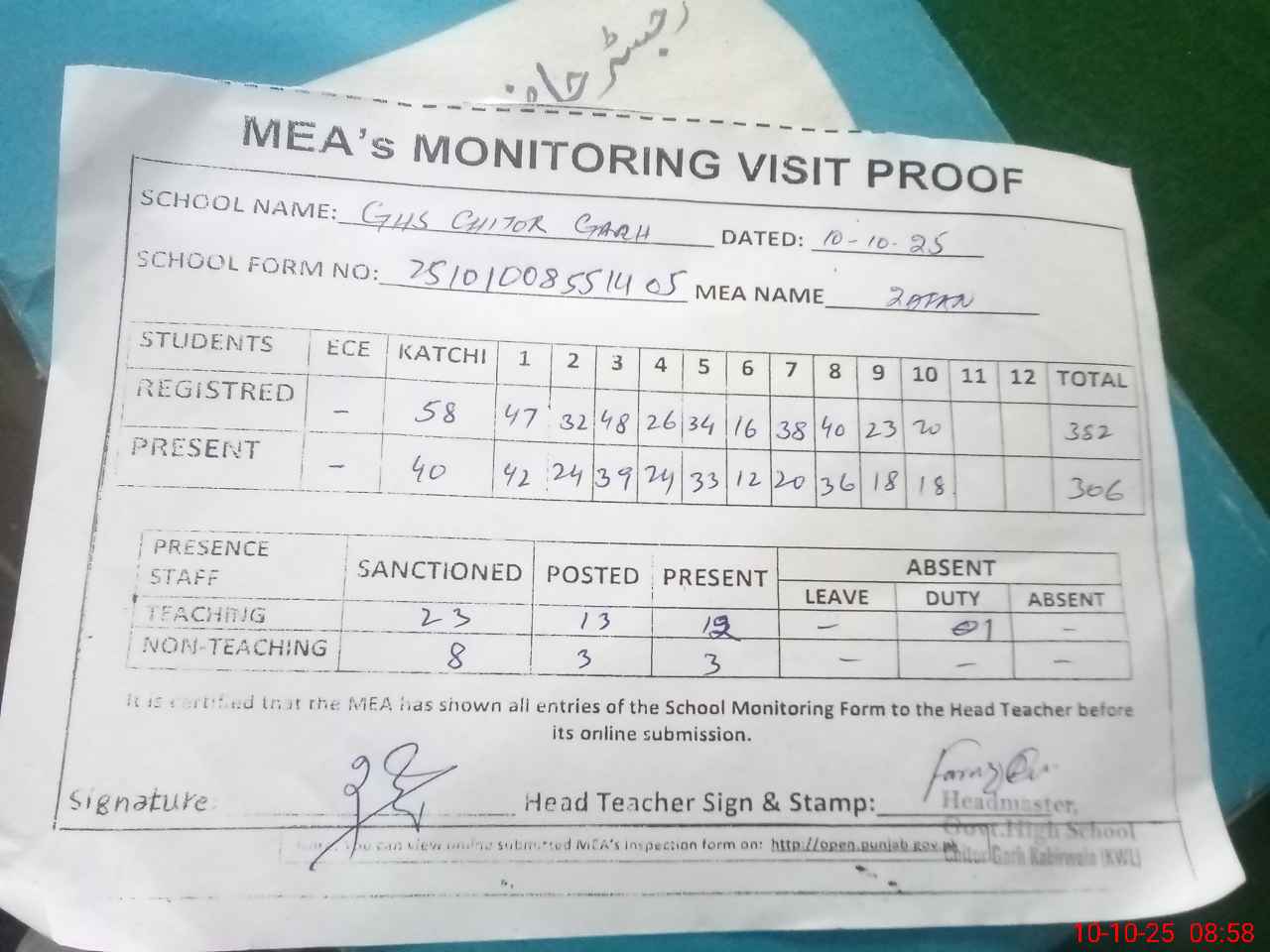 | EMIS Code: 36410090 | Name of School: GHS CHITOR GARH QADEEM, P/O CHAK HAIDER ABAD, NAWAN SHEHR | |||