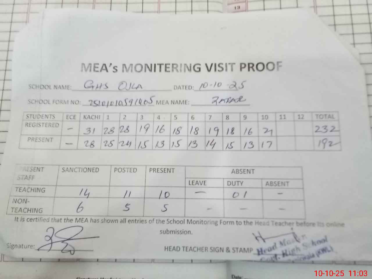 | Attendance Register | Head Teacher | MEA with School | Visit Proof |