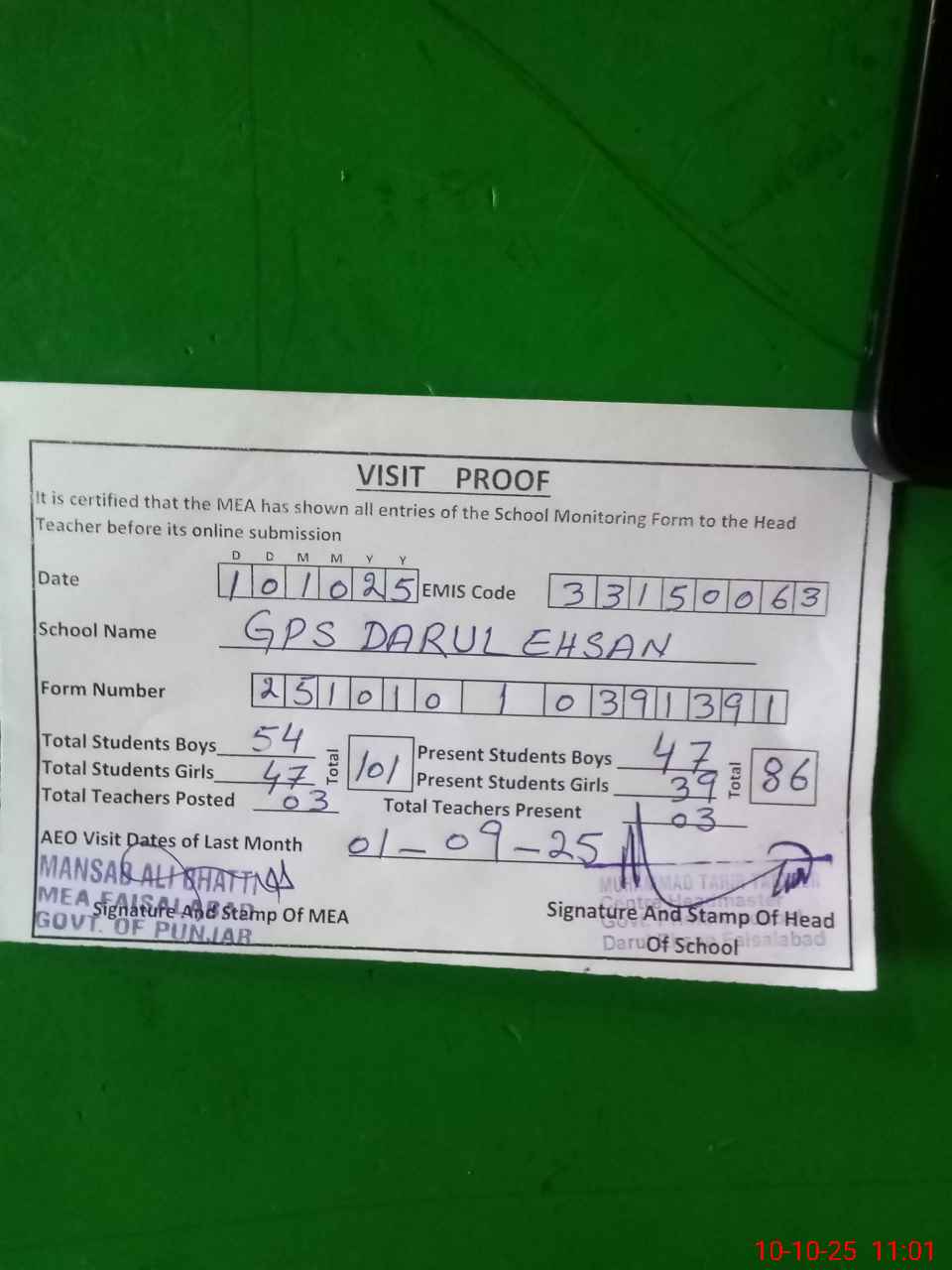 | EMIS Code: 33150063 | Name of School: GPS DARUL EHSAN | |||