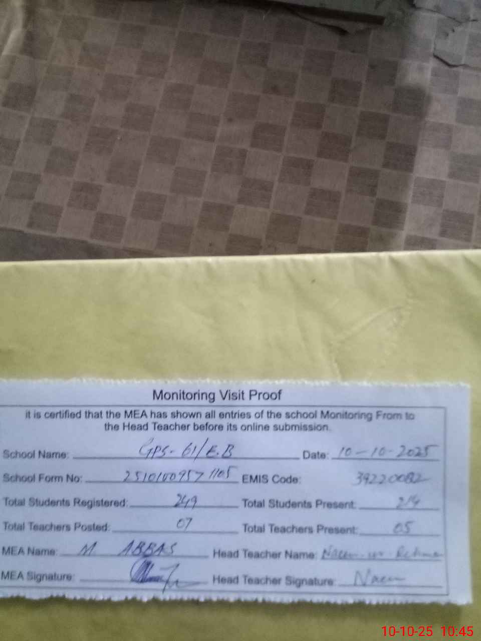 | Monitoring Date: 10-10-2025 | Start Time: 10-10-2025 09:57 AM | End Time: 10-10-2025 10:45 AM | Name of MEA: Mu**** Ab**** | |