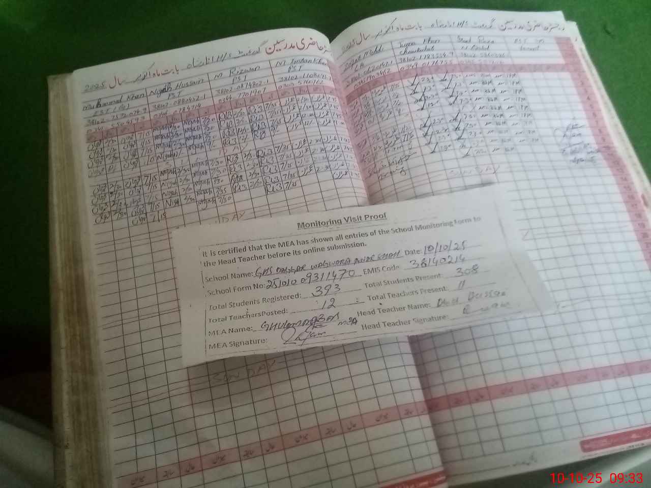 | Attendance Register | Head Teacher | MEA with School | Visit Proof |