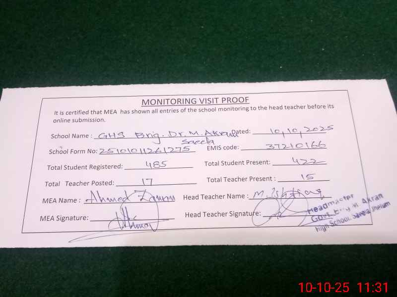| EMIS Code: 37210166 | Name of School: GHS BRIG. DR. MUHAMMAD AKRAM SAEELA | |||