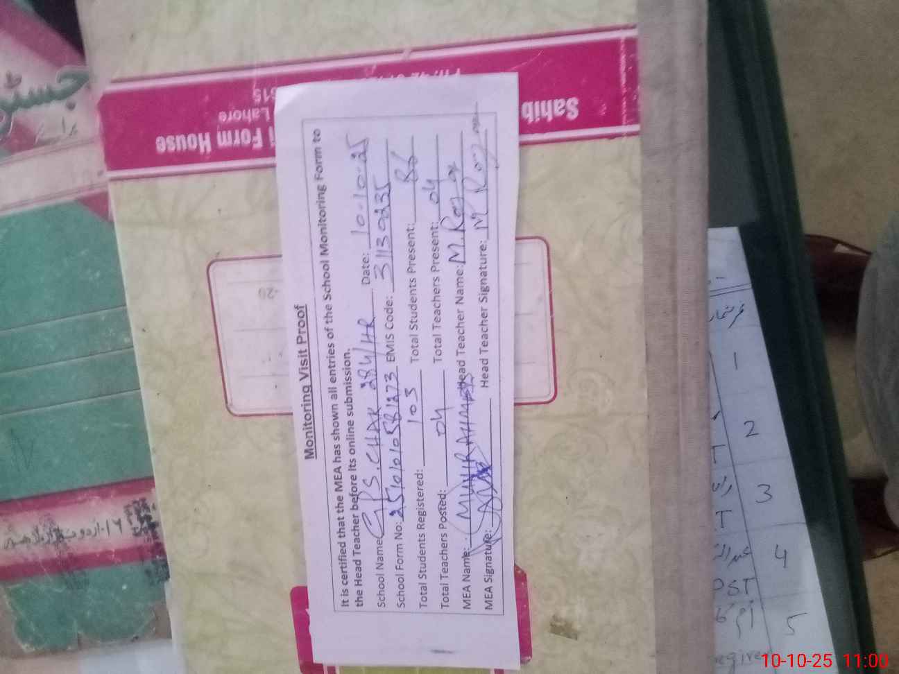 | Attendance Register | Head Teacher | MEA with School | Visit Proof |