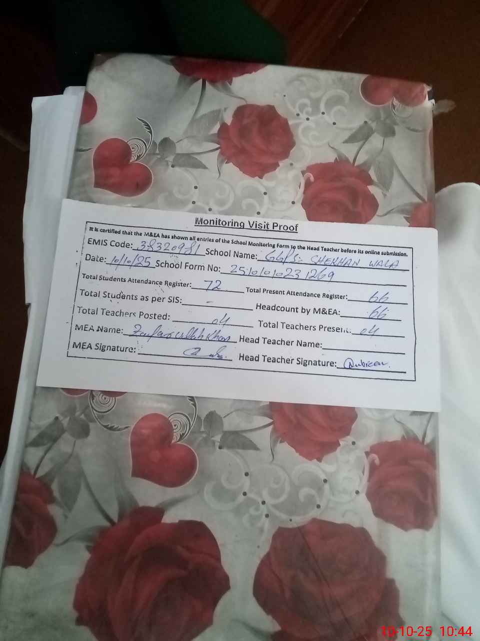 | Attendance Register | Head Teacher | MEA with School | Visit Proof |