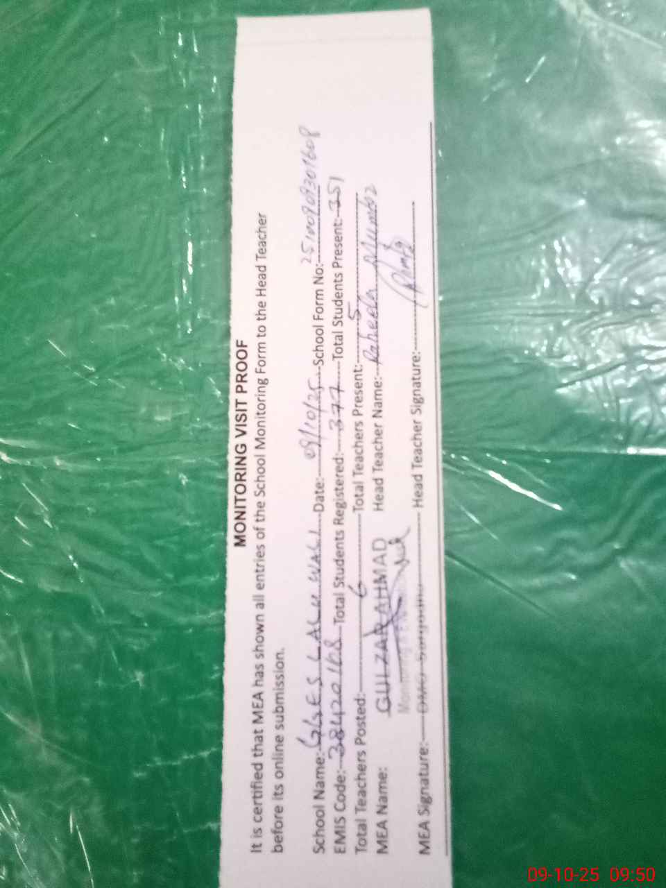 | Attendance Register | Head Teacher | MEA with School | Visit Proof |