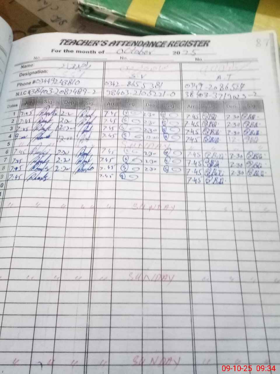 | CNIC | Full Name | Designation | R/C | Absence during last cal. month |