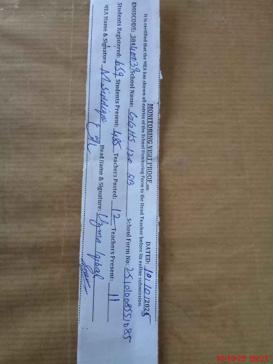 | Certified that this School was Inspected by the Undersigned MEA/DMO Today and the Information Stated Above is as Per Record. | |||||