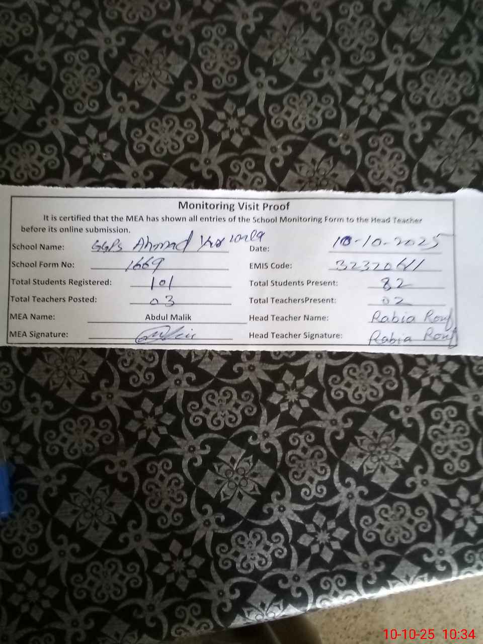 | Monitoring Date: 10-10-2025 | Start Time: 10-10-2025 09:50 AM | End Time: 10-10-2025 10:35 AM | Name of MEA: AB**** MA**** | |