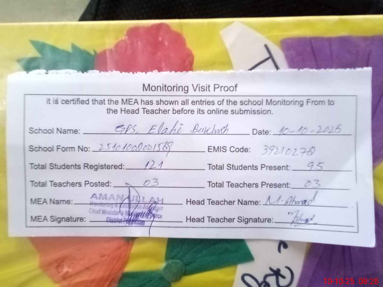| Attendance Register | Head Teacher | MEA with School | Visit Proof |