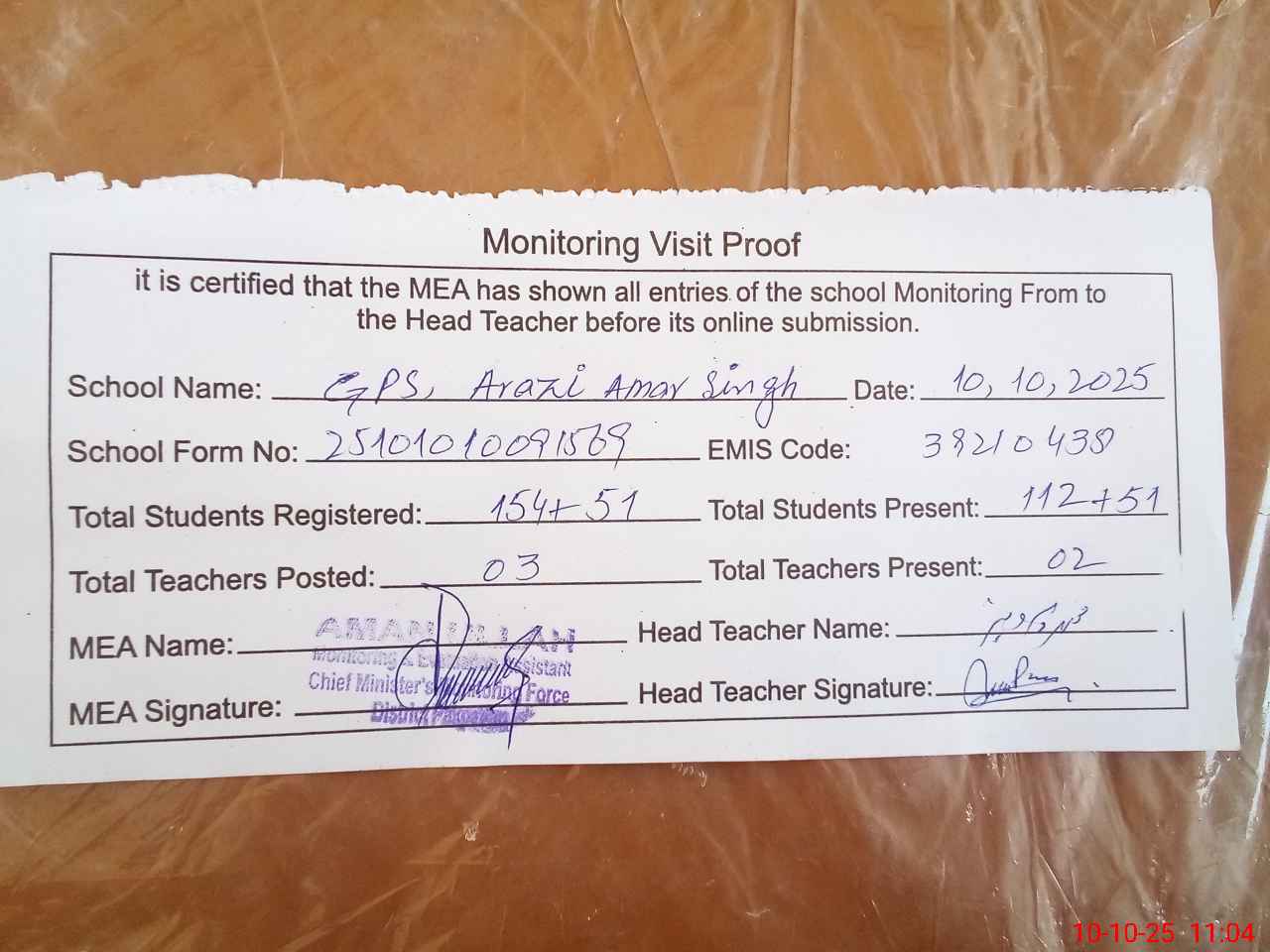| EMIS Code: 39210438 | Name of School: GPS ARAZI AMAR SINGH | |||