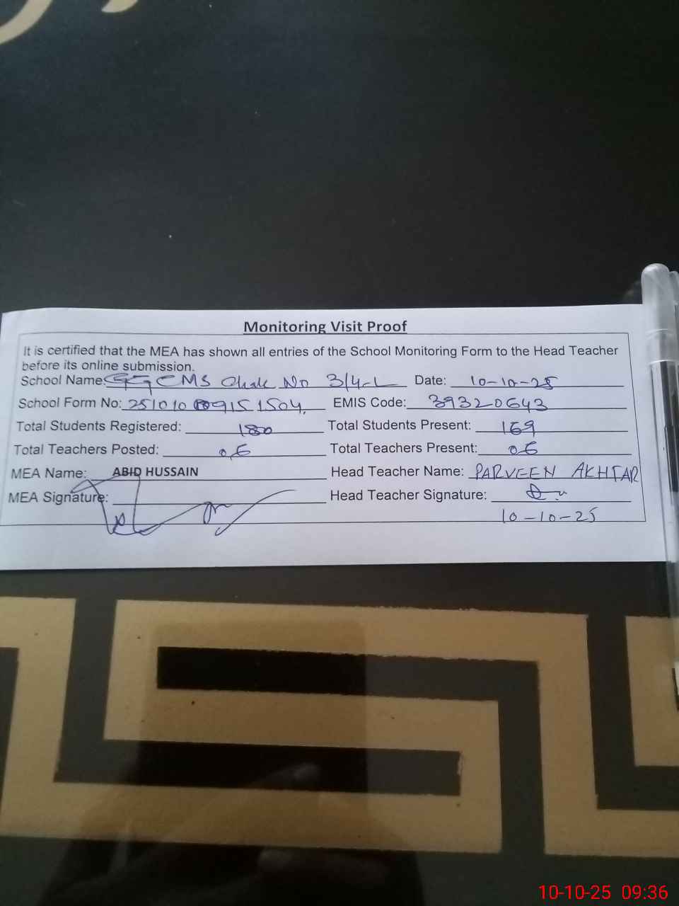 | Attendance Register | Head Teacher | MEA with School | Visit Proof |