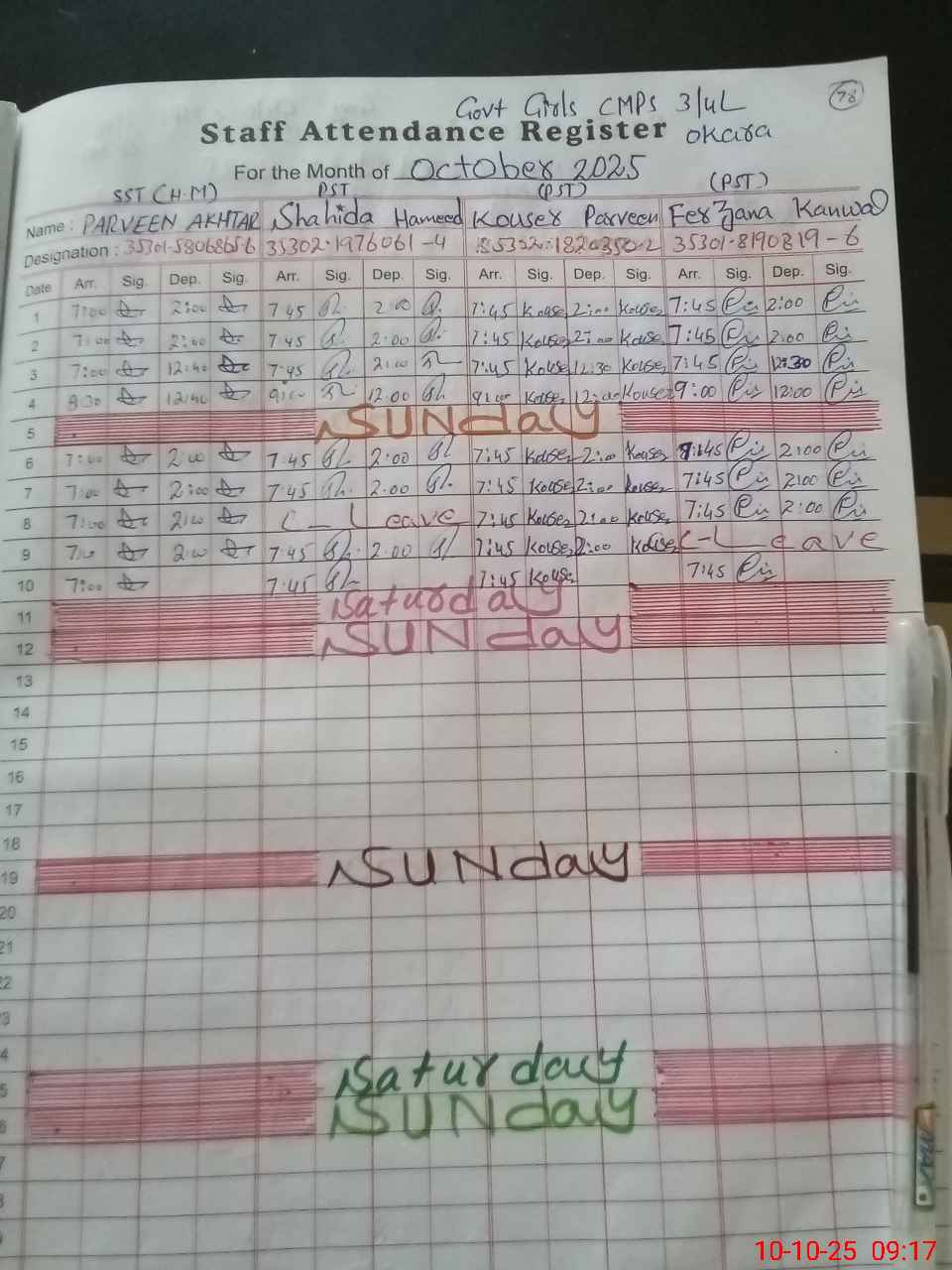 | CNIC | Full Name | Designation | R/C | Absence During Last Calender Month |