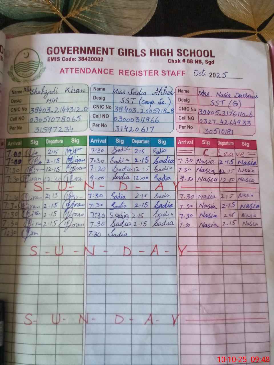 | CNIC | Full Name | Designation | R/C | Absence during last cal. month |