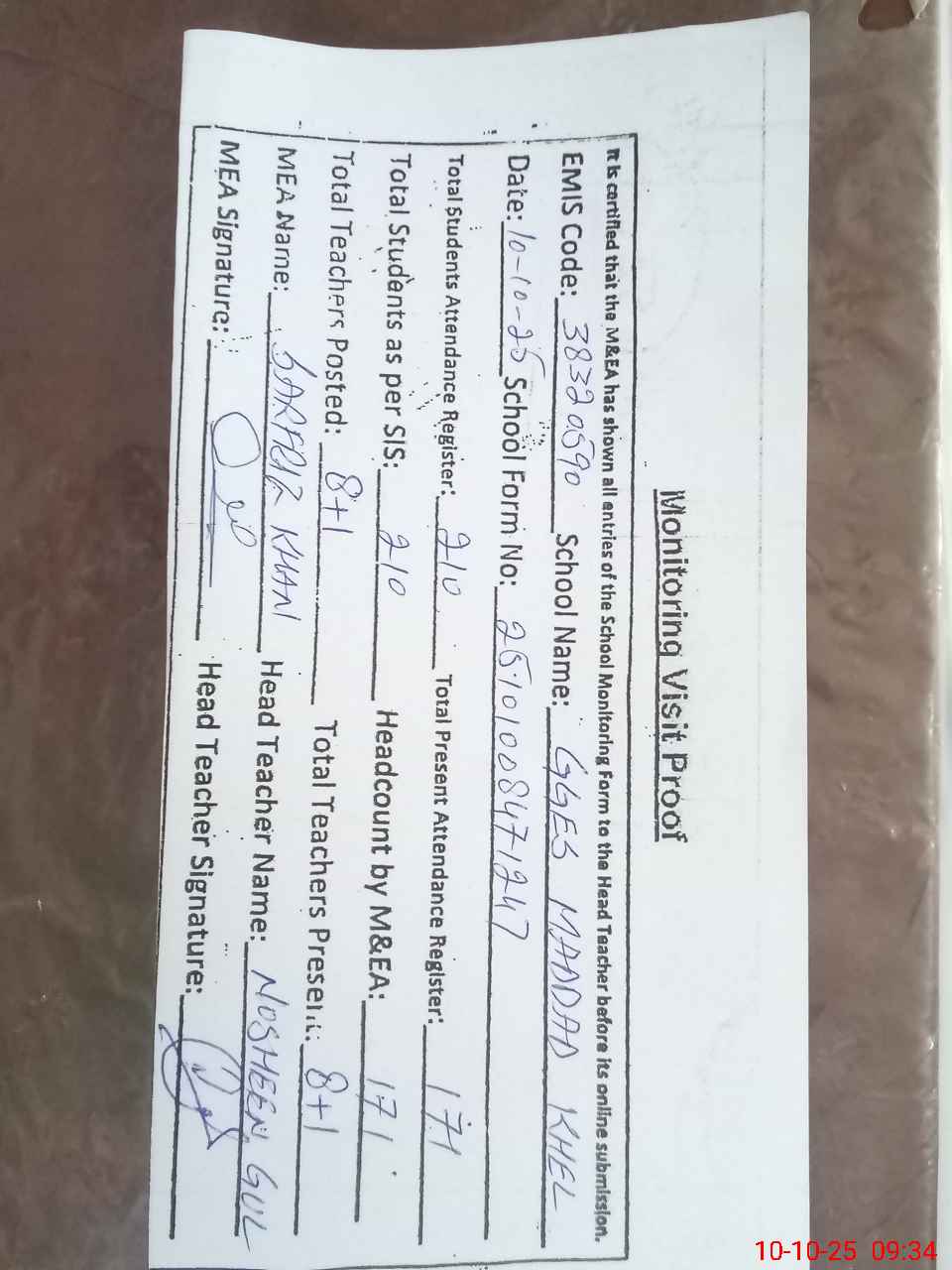 | Attendance Register | Head Teacher | MEA with School | Visit Proof |
