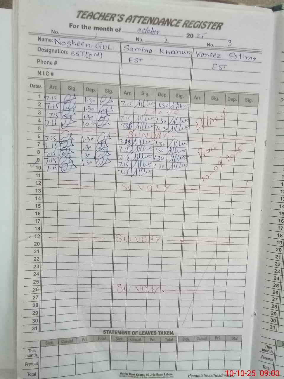 | CNIC | Full Name | Designation | R/C | Absence During Last Calender Month |
