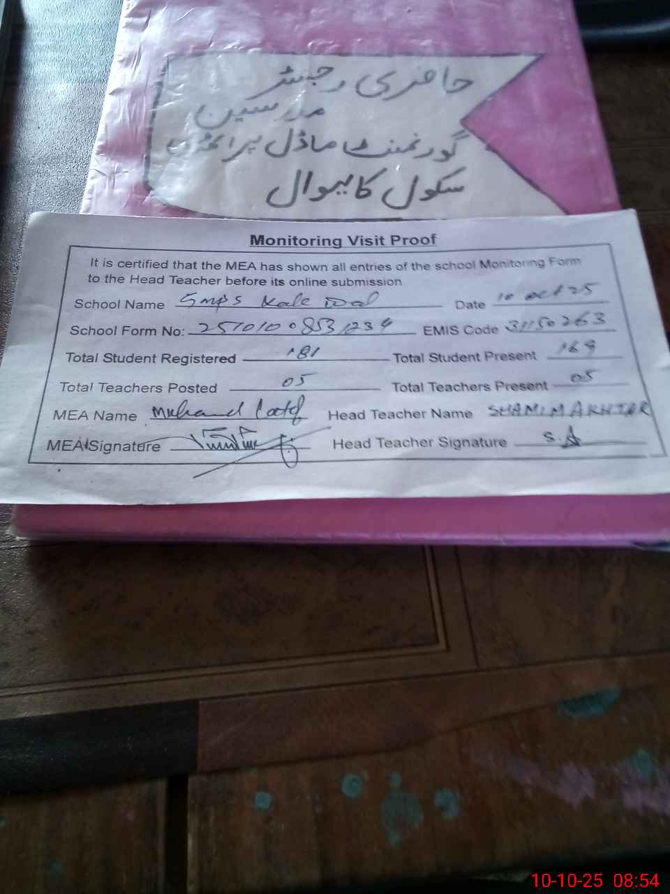 | Attendance Register | Head Teacher | MEA with School | Visit Proof |