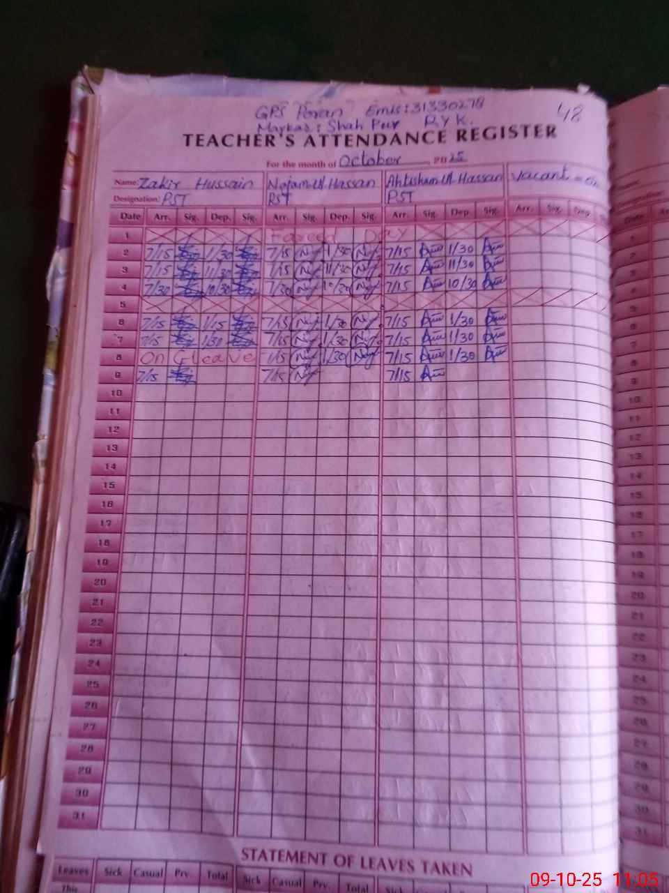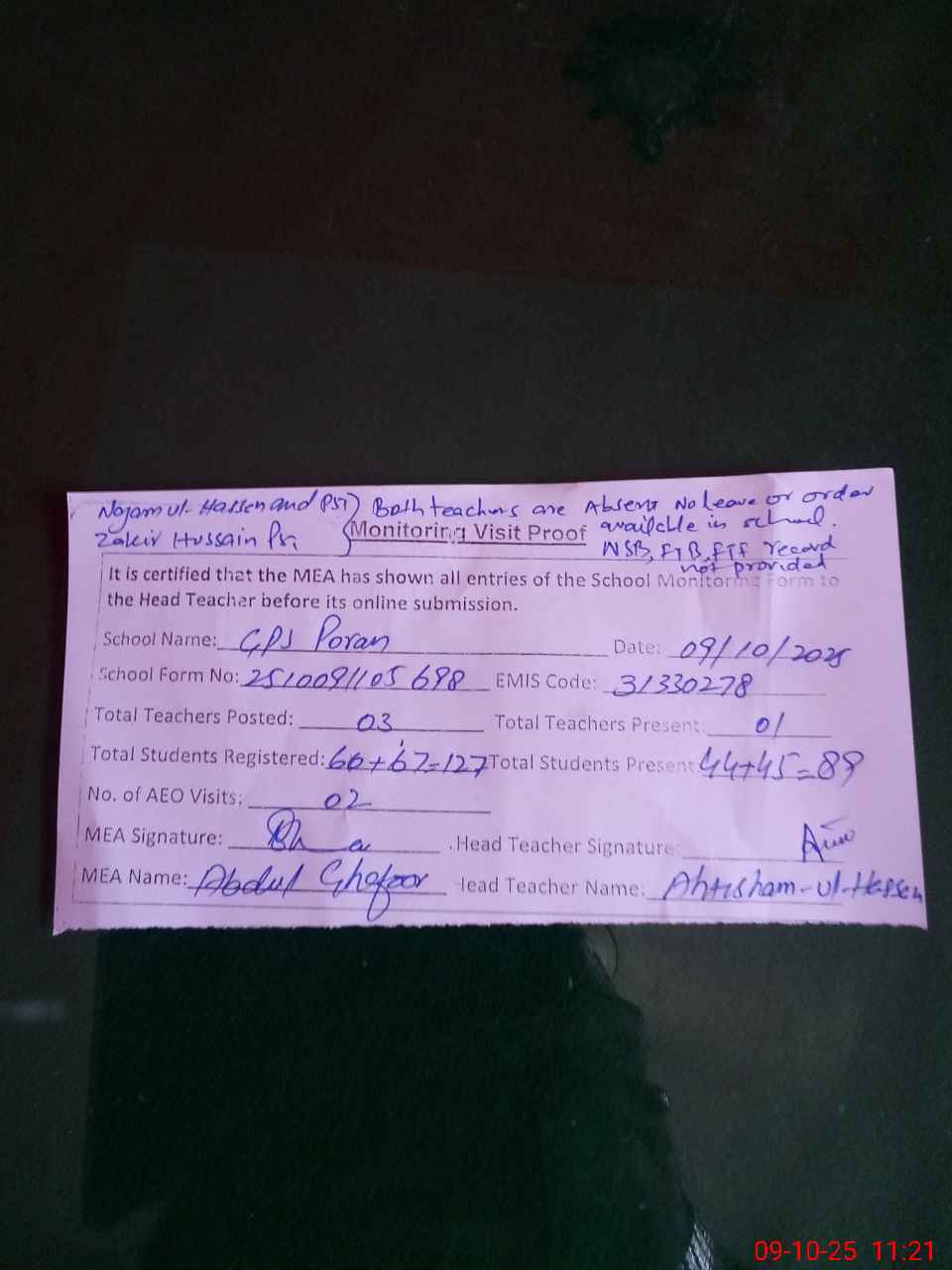 | Remarks (Use Separate Page if Required): Najma ul Hassan pst and Zakir Hussain pst both teachers are unauthorized absent no leave or order available in school NSB FTF FTB record not provided | |||||