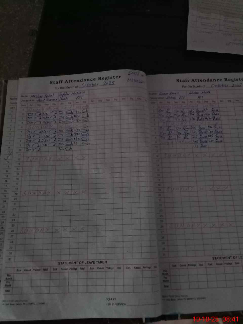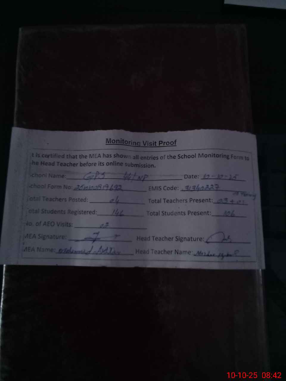 | Attendance Register | Head Teacher | MEA with School | Visit Proof |