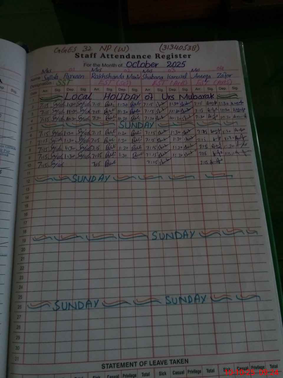 | Leave | Duty | Absent | Maternity | Medical | Ex- Pak |