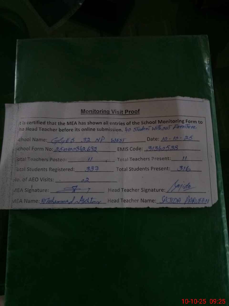 | Monitoring Date: 10-10-2025 | Start Time: 10-10-2025 08:42 AM | End Time: 10-10-2025 09:25 AM | Name of MEA: Mu**** Ak**** | |