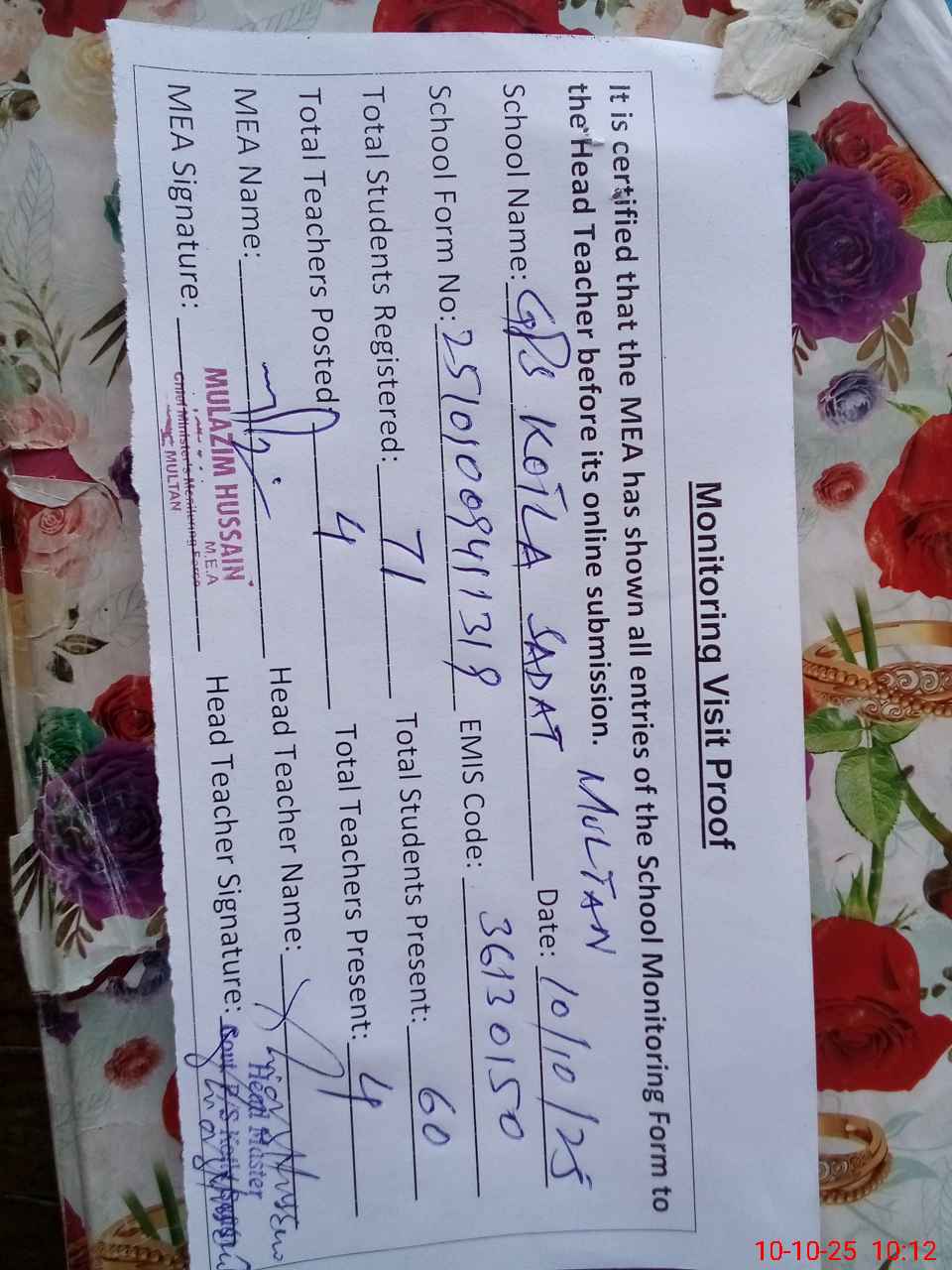 | Certified that this School was Inspected by the Undersigned MEA/DMO Today and the Information Stated Above is as Per Record. | |||||
