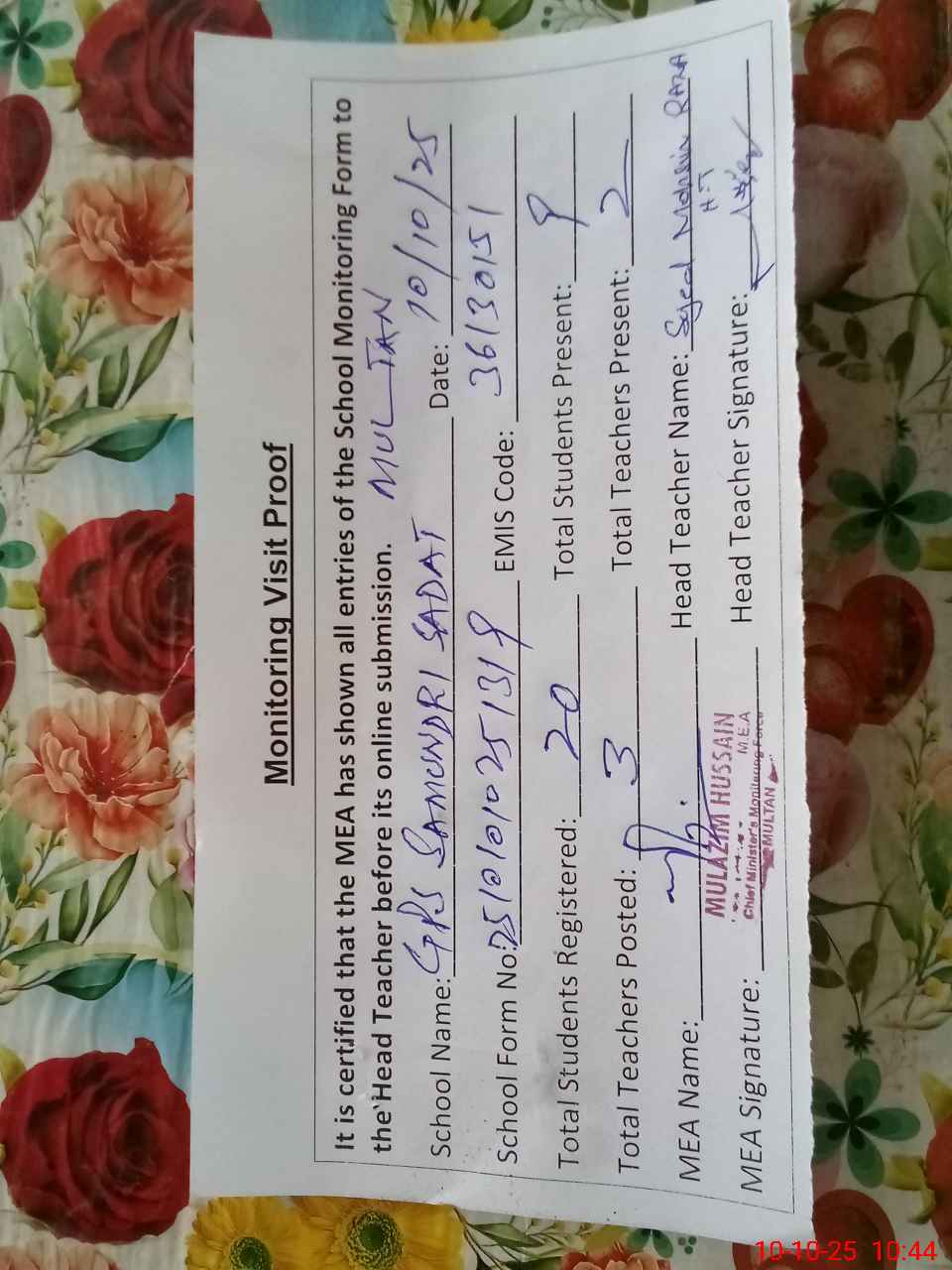| Attendance Register | Head Teacher | MEA with School | Visit Proof |