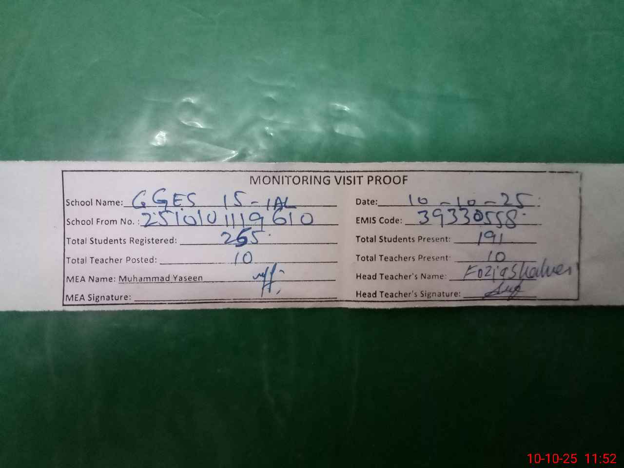 | Monitoring Date: 10-10-2025 | Start Time: 10-10-2025 11:19 AM | End Time: 10-10-2025 11:53 AM | Name of MEA: MU**** YA**** | |