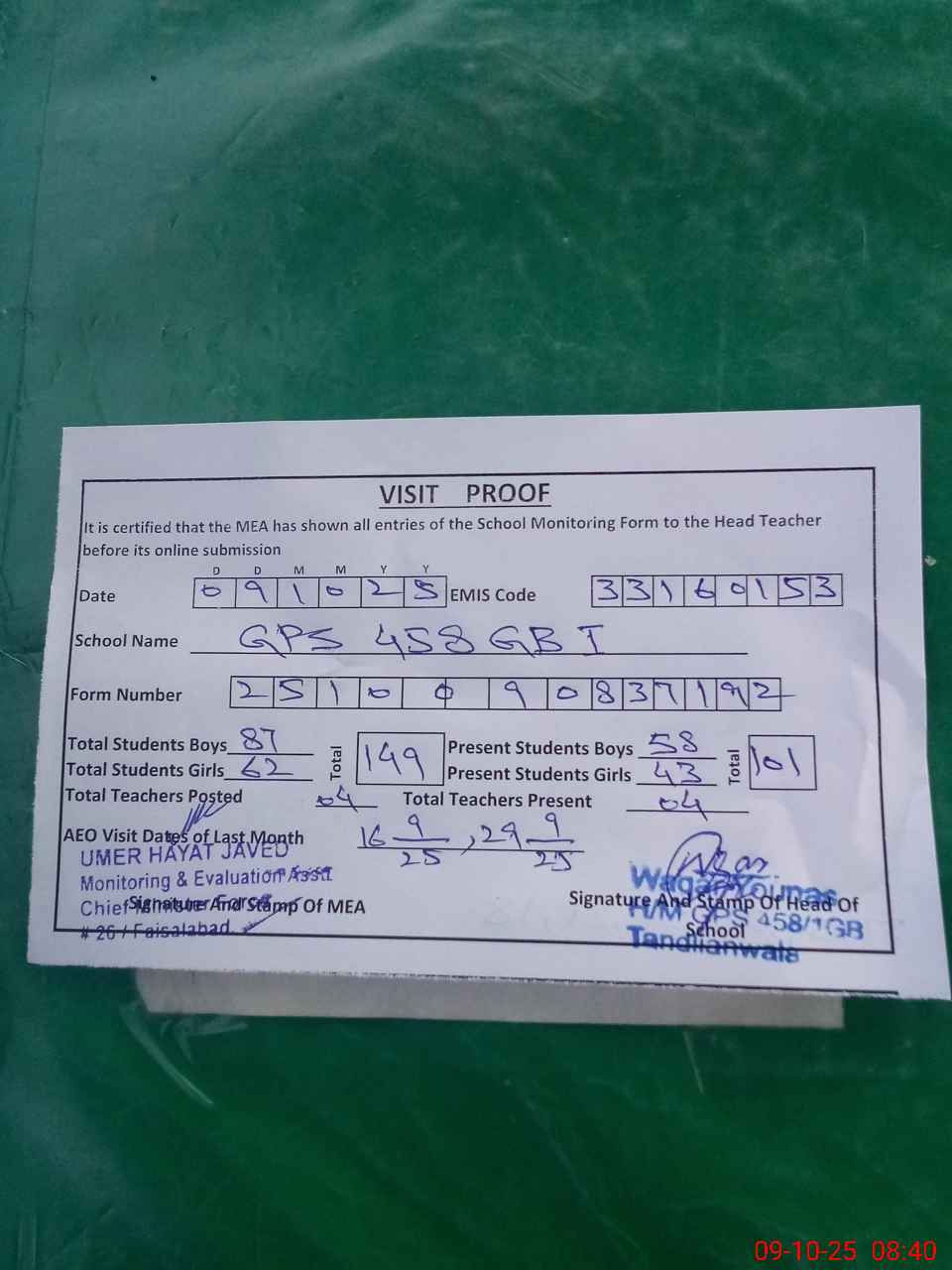 | Attendance Register | Head Teacher | MEA with School | Visit Proof |