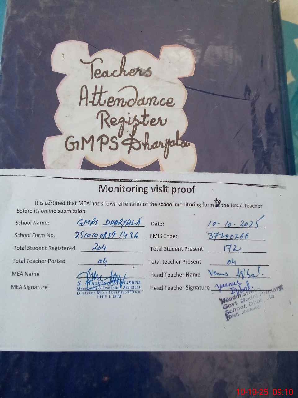| Attendance Register | Head Teacher | MEA with School | Visit Proof |