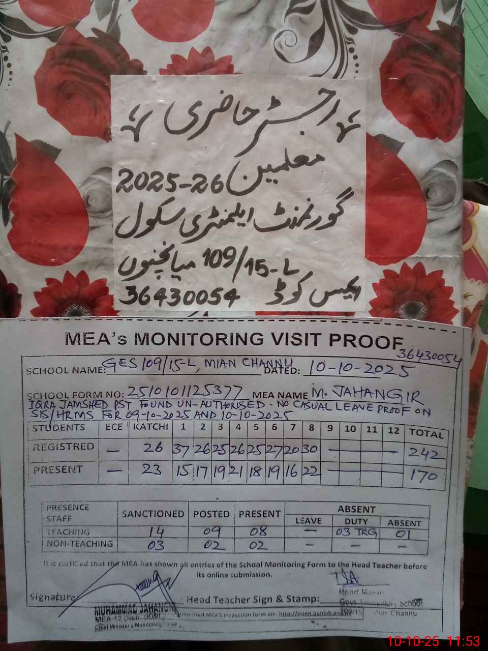 | EMIS Code: 36430054 | Name of School: GES 109/15-L, MIAN CHANNU | |||