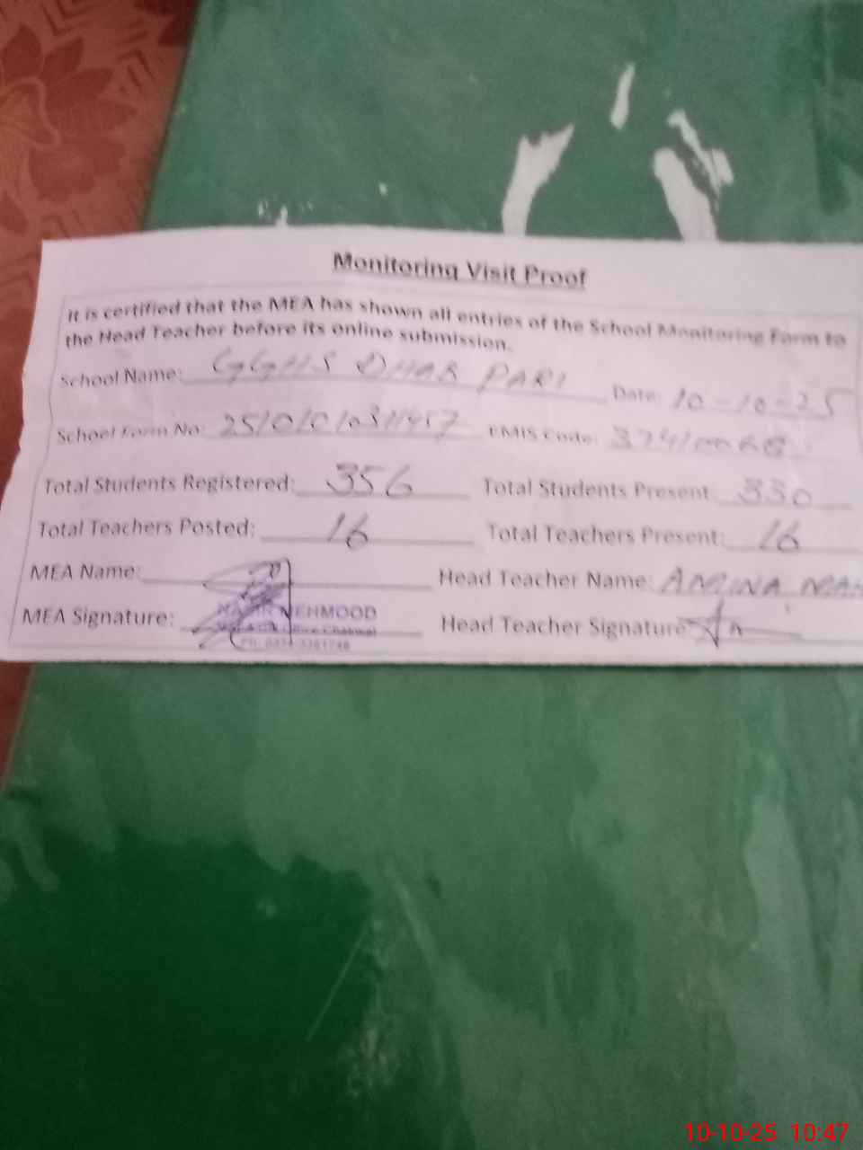 | Attendance Register | Head Teacher | MEA with School | Visit Proof |