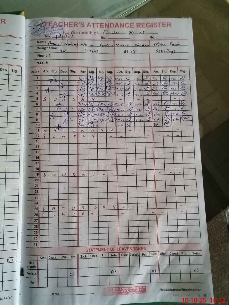 | CNIC | Full Name | Designation | R/C | Absence During Last Calender Month |