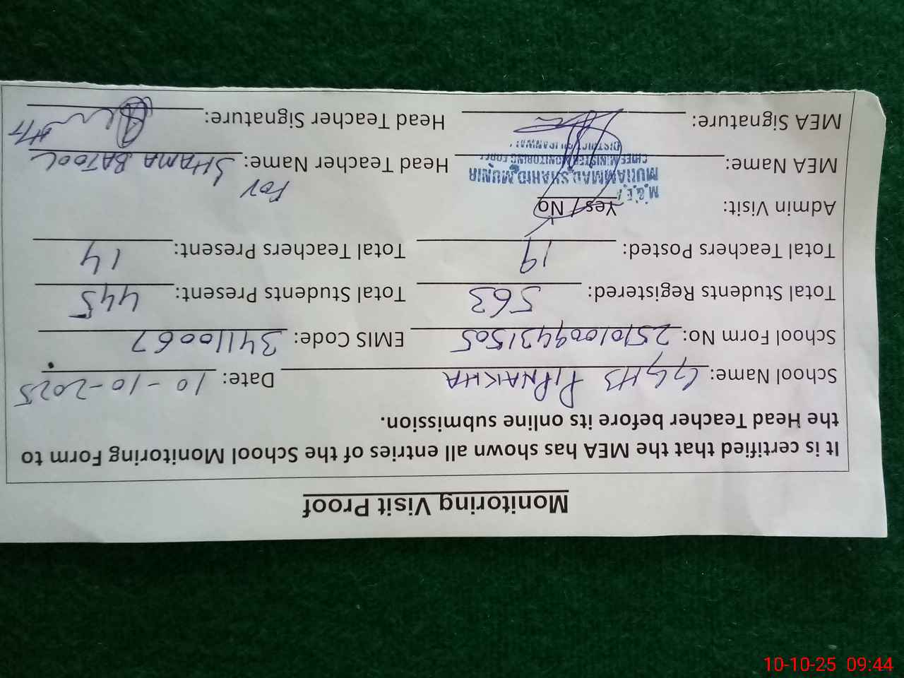 | Monitoring Date: 10-10-2025 | Start Time: 10-10-2025 08:58 AM | End Time: 10-10-2025 09:45 AM | Name of MEA: S-**** Sh**** Mu**** | |