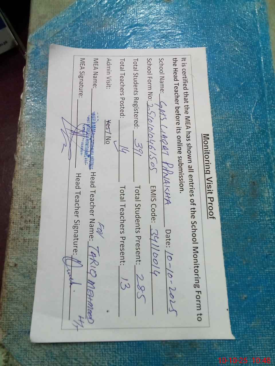 | Total no. of Classrooms: 18 No. of Classrooms Used for Teaching: 12 No. of Classrooms Storing Old Furniture, FTBs, etc: 0Comments if Any: NSB and FTF not available at school Head teacher Tariq Mahmood leave not approved |