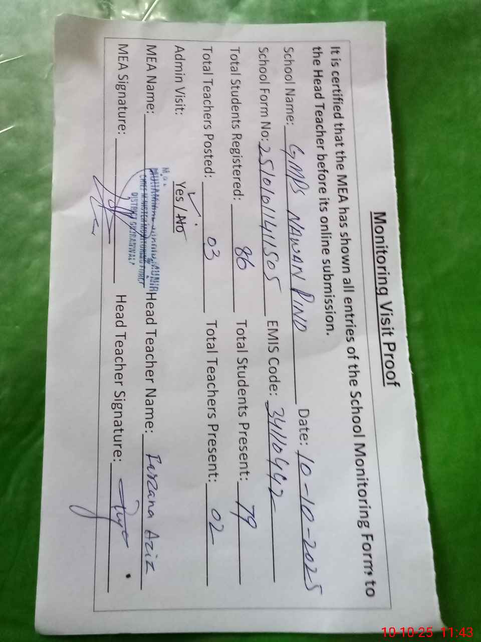 | Attendance Register | Head Teacher | MEA with School | Visit Proof |