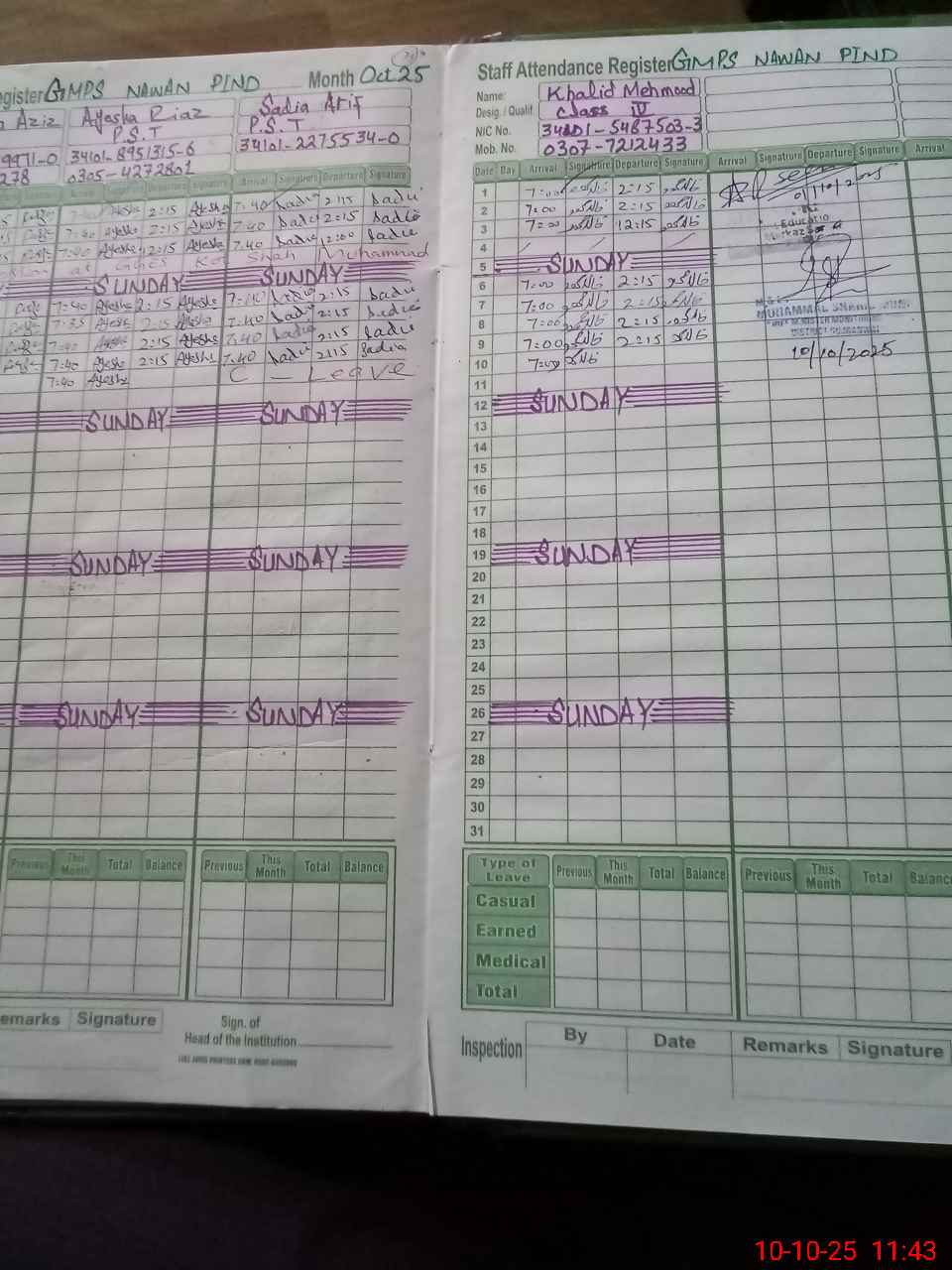 | CNIC | Full Name | Designation | R/C | Absence During Last Calender Month |